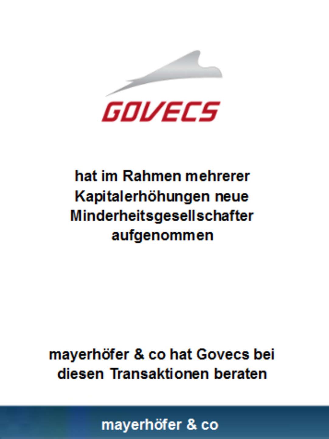 Die Govecs GmbH hat im Rahmen mehrerer Kapitalerhöhungen neue Minderheitsgesellschafter aufgenommen. mayerhöfer & co hat Govecs bei diesen Transaktionen beraten.
