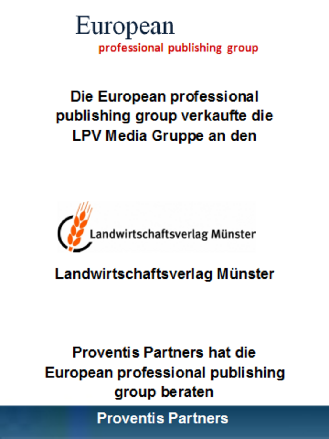 Die European professional publishing group hat die LPV Media Gruppe an den Landwirtschaftsverlag Münster verkauft. Unser Mitglied Proventis Partners hat die Transaktion initiiert und den Verkäufer beraten.