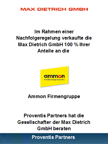 Im Rahmen einer Nachfolgeregelung hat die Max Dietrich GmbH 100 % Ihrer Anteile an die Ammon Firmengruppe verkauft. Unser Mitglied Proventis Partners hat die Transaktion initiiert und den Verkäufer beraten.