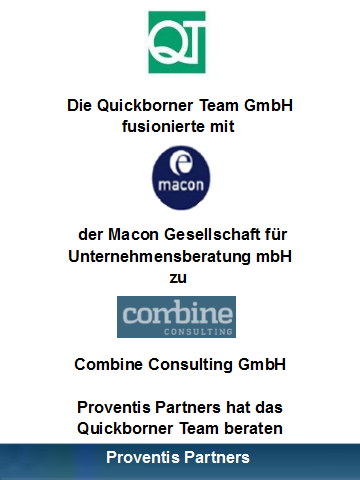 Im Rahmen eines M&A Mergers der beiden Unternhemensberatungen Quickborner Team und macon GmbH,haben sich die beiden Gesellschaften zu Combine Consulting zusammen geschlossen. Unser Mitglied Proventis Partners hat das Quickborner Team im Rahmen der Fusion beraten.